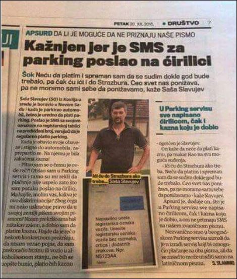 ,,Апсурд је што је у Паркинг сервису све написано на ћирилици, чак и казна коју је добио, а они не признају СМС на нашем званичном писму“ додао је Саша.