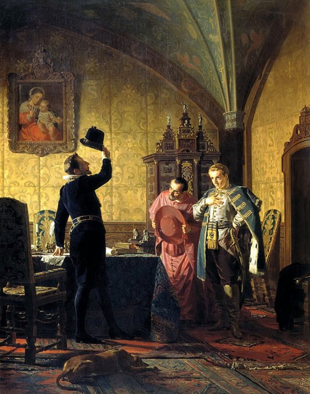 *На слици Николаја Неврева: Лажни Димитрије (обријан) даје заклетву пољском краљу Сигисмунду III да ће у Русију увести папизам.