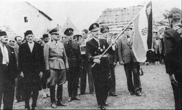 фото Историјска архива: Ministar vitez dr Vjekoslav Prančić predaje zastavniku Čustoviću svilenu ratnu zastavu odlikovanu Poglavnikovom vitežkom kolajnom za hrabrost Miliciji Fazlagića Kule dana 4.VII.1943. Prvi sa lijeva Smail Dilić drugi s lijeva Memišaga Džuhur; do njega general Mihajlo Lukić, zapovjednik III. zbora u Sarajevu; savjetnik Predsjedništva vlade Hasan Ćustić, mostarski logornik Ahmed Hadžić i veliki župan dr.Ante Buć