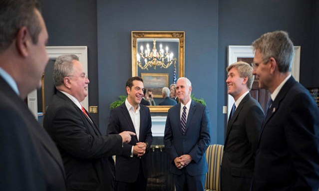 Никос Коцијас, Алексис Ципрас, Мајк Пенс и Џефри Пајет (у првом плану,десно)