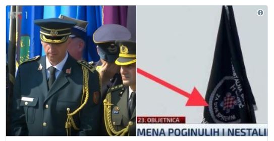 Црногорски официр Иван Машуловић на прослави „Олује“ испод усташке шаховнице са натписом „За дом спремни“