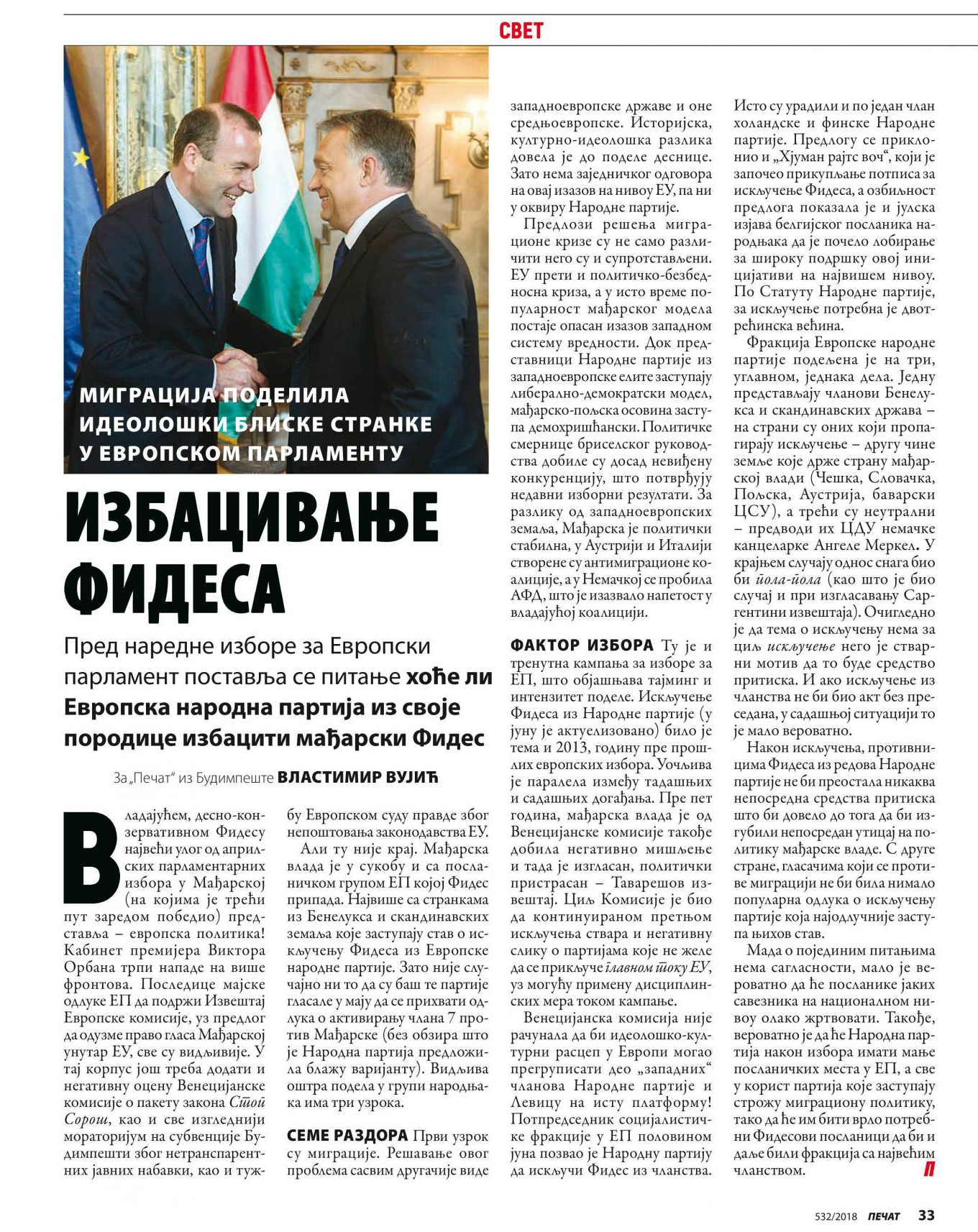 Владајућем, десно-конзервативном Фидесу највећи улог од априлских парламентарних избора у Мађарској (на којима је трећи пут заредом победио) представља – европска политика! Кабинет премијера Виктора Орбана трпи нападе на више фронтова. Последице мајске одлуке ЕП да подржи Извештај Европске комисије, уз предлог да одузме право гласа Мађарској унутар ЕУ, све су видљивије. У тај корпус још треба додати и негативну оцену Венецијанске комисије о пакету закона Стоп Сорош, као и све изгледнији мораторијум на субвенције Будимпешти због нетранспарентних јавних набавки, као и тужбу Европском суду правде због непоштовања законодавства ЕУ.