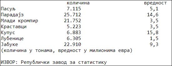 Слично је с поврћем. Осим Грчке, Турске и Албаније, што је досад било уобичајено, парадајз смо ове године увозили и из Хрватске. Кромпир такође увозимо из многих земаља, највише из Немачке, Грчке, Француске, Холандије и Италије, а неке туре стижу нам чак и из Египта и САД. Црни лук нам допремају из далеког Перуа, док бели већ традиционално увозимо из Кине. Зелена салата стиже из Туниса и Шпаније, шаргарепа из Русије и Велике Британије, а краставци из Марока и Албаније. Највише увозног пасуља стигло је из Киргистана, а потом из Аргентине , Бугарске, Египта, Канаде, Пољске и Казахстана.