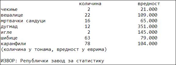 Србија се поноси и вековним узгојем свиња, а на листи артикала у првих шест месеци ове године нашле су се две тоне чекиња од дивље и питоме свиње које смо купили у далекој Кини. Из ове земље смо увозили и дрвене вешалице, као и из Турске и Немачке, док смо рогове и кости куповали из Италије. Пластичну дугмад допремали смо из Турске и Немачке, а мртвачке сандуке из Словеније, Мађарске и Босне и Херцеговине. Па шибице из Русије, чачкалице из Кине, конац из Хрватске, а сви ови производи продају се у Србији.