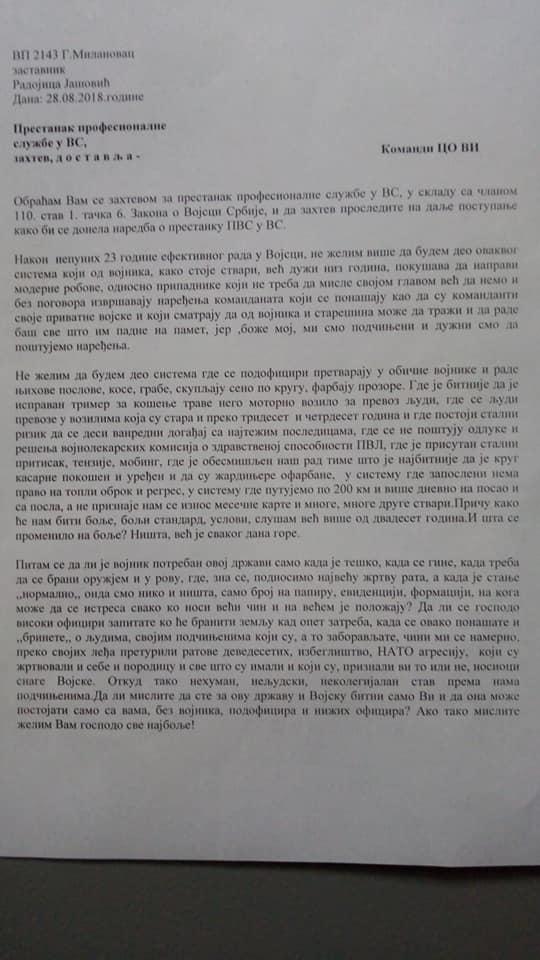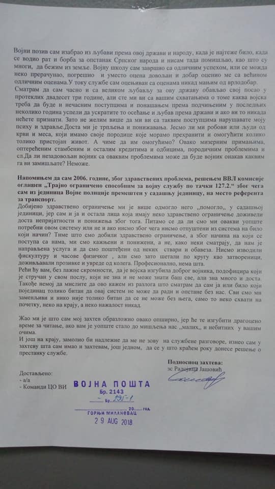 „Тешка срца сам се одлучио на овај чин после 23 године рада у војсци, али у војсци има доста оних који нас својим потезима и нељудским понашањем терају на овакав потез“ – написао је на свом фејсбук профилу Радојица Јашовић, заставник Војске Србије, који је поднео захтев за престанак професионалне службе 28. августа 2018. године.