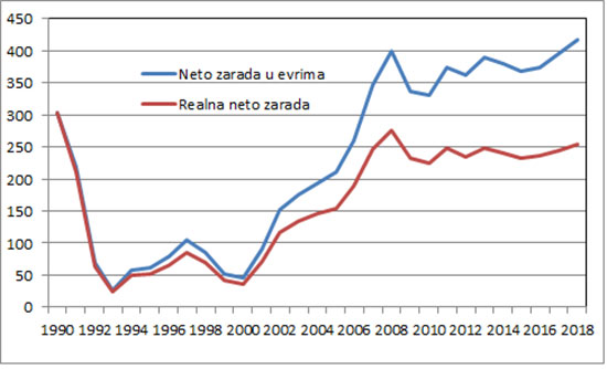 Просечна зарада у Србији у мају 2018 износила је 417 евра. Да би садашња плата била реално једнака као и у 1990. она би требало да износи 498 евра