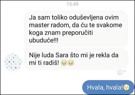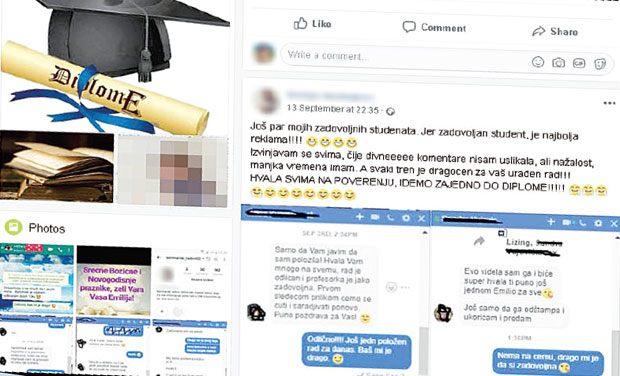 – Идемо заједно до дипломе – стимулативна је порука са већине њених постова, где се на фотографисаним препискама са задовољним муштеријама деле комплименти, захвалност за указано поверење, честита за оцене стекнуте неморално. Податке за уплату шаљу поруком. Чим легне уплата, стиже рад.