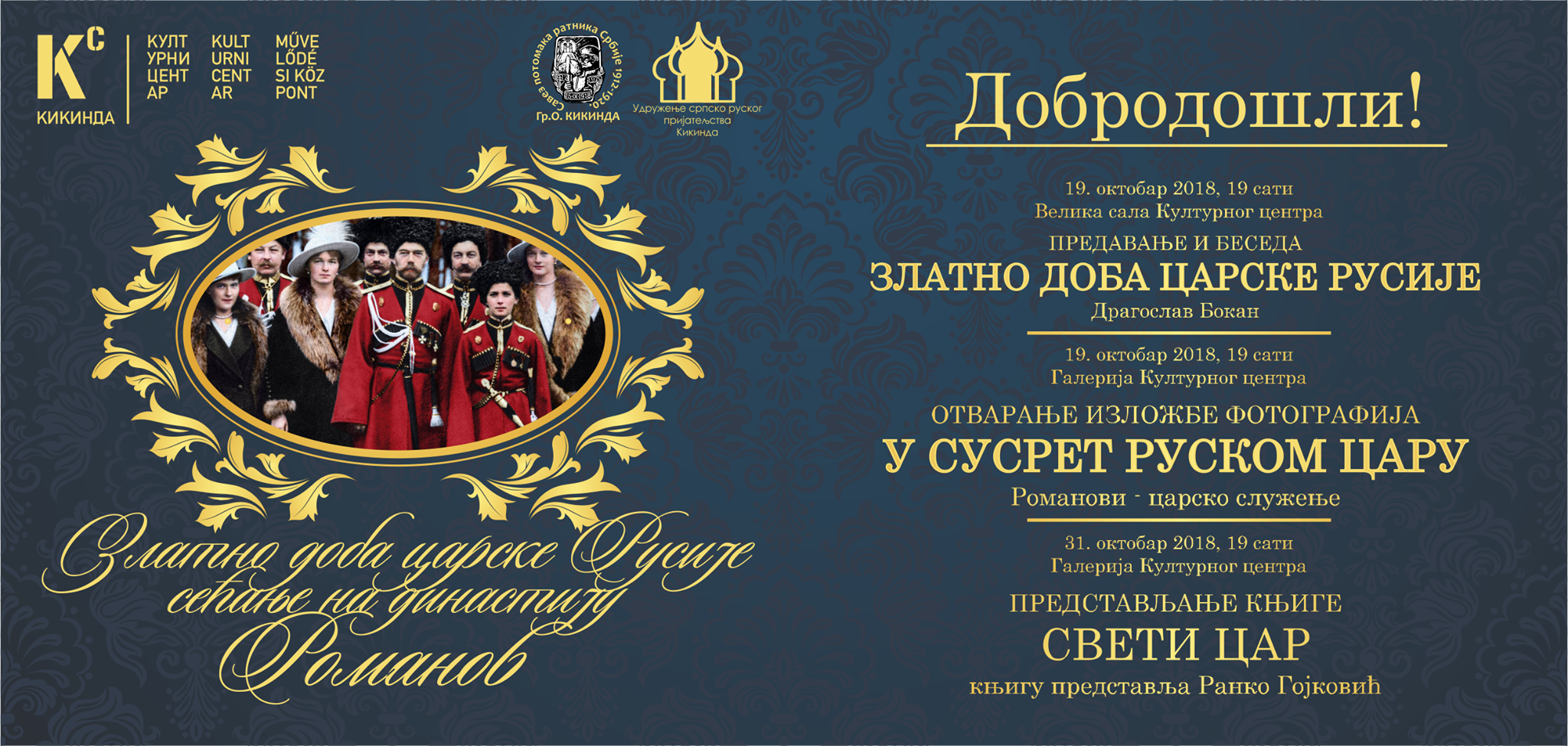 Удружења Савез потомака ратника Србије 1912-1920 и Удружење српског руског пријатељства из Кикинде у сарадњи са Културним центром Кикинда организују изложбу фотографија „У сусрет Руском Цару. Романови – царско служење“ која је посвећена последњем Руском цару Николају II и његовој породици.
