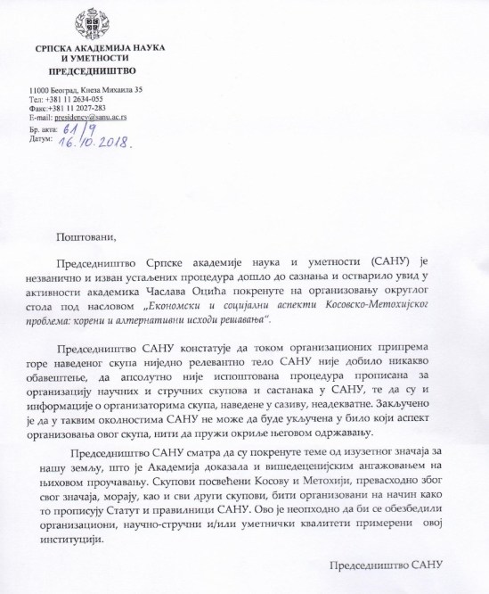 „Никаквих пропуста у процедури, а ни у организацији, округлог стола о КиМ планираног за 24. октобар у организацији Одбора за економске науке и Академијског одбора за проучавање становништва није било.