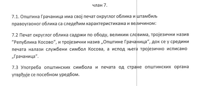 | Ово је део статута шиптарске општине Грачаница уређене по законима „републике Косово“. Цео статут можете погледати и преузети на сајту ове „институције“ кликом на ВЕЗУ ДО СТРАНЕ |