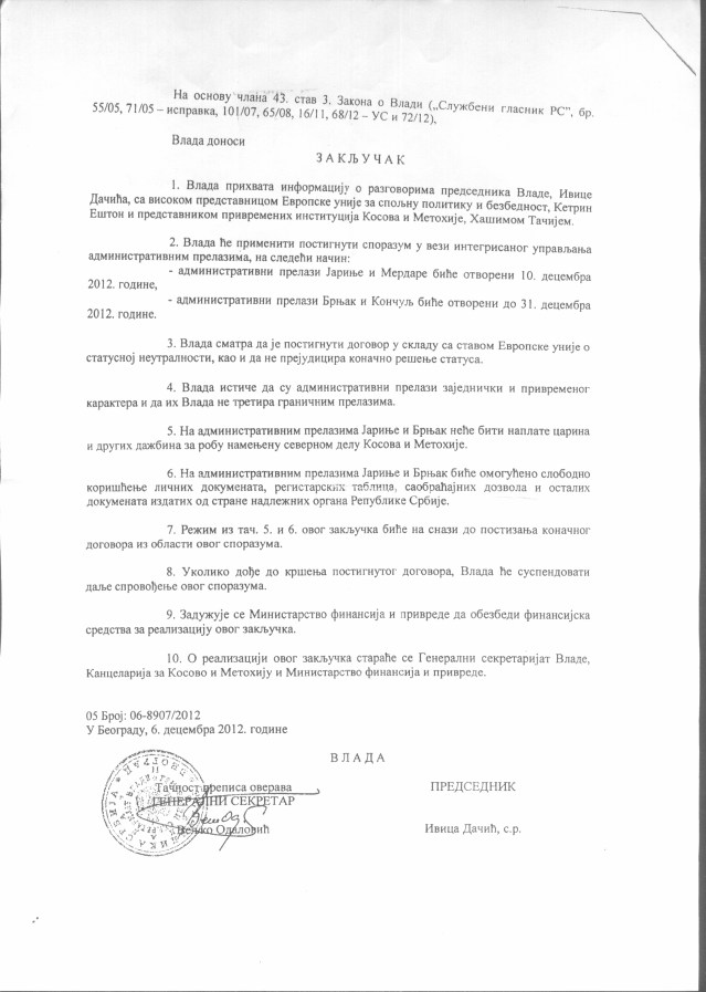 Прилог: Одлука Владе Србије од 6.12.2012. (када је председник Владе био Ивица Дачић а први потпредседник Александар Вучић) којом је успостављена граница између Косова и Метохије и остатка Србије.