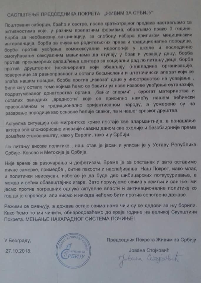 Није време за разочарања и дефетизам. Време је за опстанак и зато оставимо личне замерке, примедбе, ситне пакости и наслађивања. Наш Покрет, иако млад и политички неискусан, избегао је да буде део шибицарских поткусуривања, а можда и већих обавештајних игара. Зато поручујемо свима у земљи и ван ње- ми јесмо против погрешних одлука актуелне власти и антинационалне политике ко год да је спроводи, али нисмо и никада нећемо бити против сопствене државе.