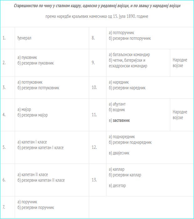 Значај пуковске заставе утицао је и на то да се у српској војсци уведе чин заставника. Нови чин био је најнижи по рангу. Према наредби намесника краља Александра Обреновића из 1890. године, којим се прописује старешинство по чину у сталном кадру, односно у редовној војсци, и по звању у народној војсци, под редним бројем 11. налазе се ађутант, водник и заставник (под в).