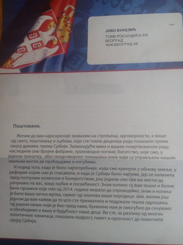 Добио сам пре два-три дана поштом писмо председника Србије А. Вучића.