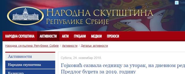 На сајту Народне скупштине Републике Србије објављен је дневни ред за седницу Народне Скупштине Р. Србије која заказана за уторак 27. новембар 2018. (текст у прилогу). Ради прегледности, наша редакција је тачке дневног реда одвојила у пасусе и извршила нумерацију.