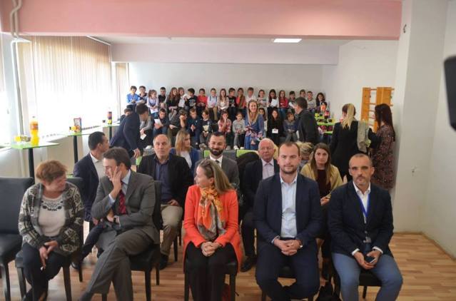 Свечани дочек амбасадора Велике Британије на Косову. За дочек задужена помоћница директорке Бисерка Симић, лично (прва с лева). У позадини деца „довучена“ са наставе која је у току.