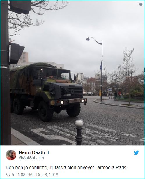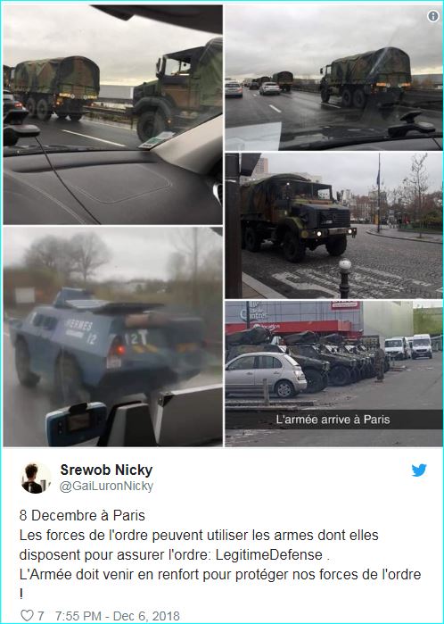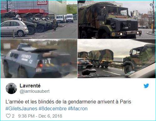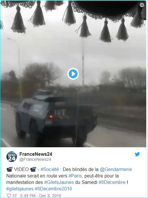 Фотографије и видео снимци оклопних возила која се, како се наводи, приближавају Паризу због суботњег протеста појавиле су се на твитеру. Раније је француски премијер најавио возила жандармерије на протестима.