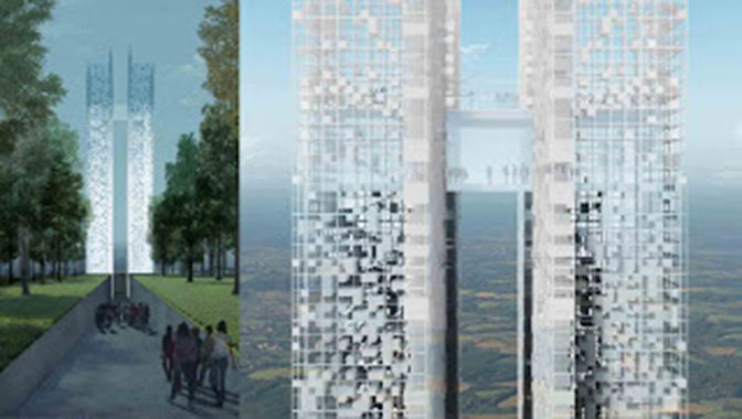 На Конкурсу за идејно решење Меморијалног комплекса на врху парка природе планине Цер победио је пројекат који по нехуманости и суровости у уништењу природног амбијента нема преседана. Првонаграђено решење архитеката Иље Микитишина, Игора Микитишина, Миљана Салате и Рајка Анђелића чине два брутална небодера начињена у конструкцији металних решетака са уметнутим кубусима, постављена један уз другог – усред јединственог заштићеног парка природе. У покушају да на пројекту пребројим број структурних етажа ових вишеспратница, дошао сам чак до броја 40! Поставивши мегаломанске четрдесетоспратнице на врх питоме планине, пројектанти су креирали гигантски монструм који нема карактеристике споменика, а понајмање приличи природном амбијенту. Наметнули су урбанистичку асоцијацију на њујоршке Куле близнакиње које су, за разлику од пренасељеног забетонираног Менхетна, подигнуте на месту где је императив очување изворног природног окружења. Споменик „употпуњују“ недирнутој природи непримерени садржаји Музеја великог рата, Документационог центра, Едукативног центра, чак и објекти пансионског смештаја, површине невероватних 5.000 метара квадратних!