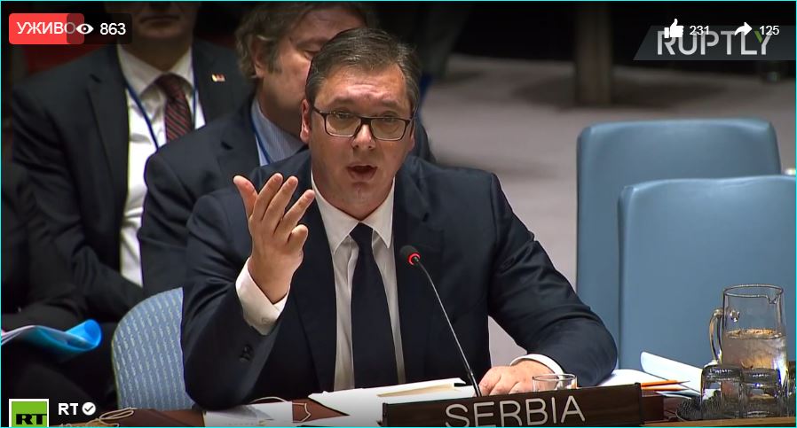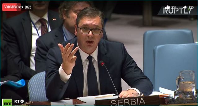 Председник Србије Александар Вучић упознао је вечерас Савет безбедности УН, али и светску јавност, са настојањем Приштине да правним и политичким насиљем, економским притисцима и једностраним потезима, попут увођења такси и формирања тзв војске Косова, створи нову ситуацију на терену и изнуди признање од Србије, мимо дијалога о нормализацији односа са Београдом.