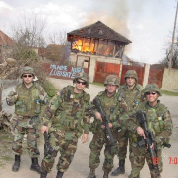 Амерички војници се забављају фотографишући се испред запаљене српске куће.