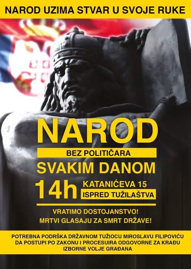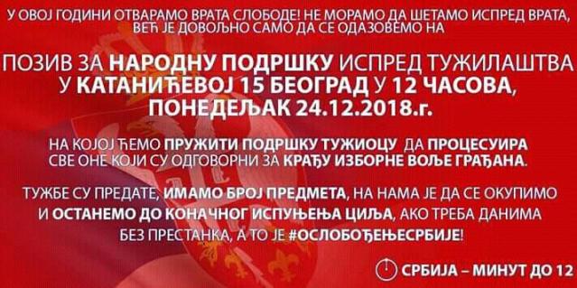 Зато схватимо све ово озбиљно, дођимо масовно испред тужилаштва у Београду, улица Катанићева бр.15. дајмо прво подршку народу који је од 24.12.2018.године испред тужилаштва а затим подршку тужиоцу да изврши уставну и законску обавезу покрене и процесуира процесуира све који су извршили изборну крађу народне воље“.