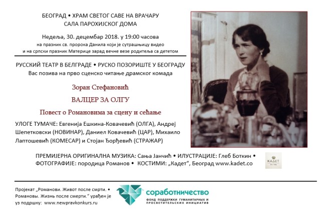 У недељу, 30. децембра у 19 часова у сали дома Храма светог Саве на Врачару у Београду сценским читањем биће представљена нова драма „Валцер за Олгу“ са поднасловом „Повест о Романовима за сцену и сећање“ писца Зорана Стефановића. Улаз је слободан.