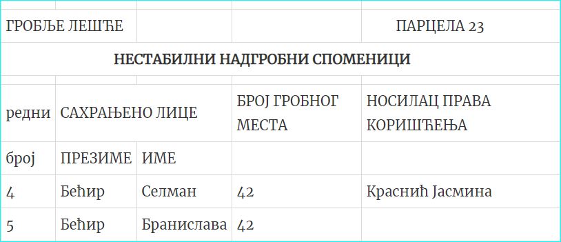 Напомена: Пронашли смо ових дана на интернету документ (у прилогу) који констатује да су Селаман и Бранислава Бећир сахрањени на гробљу Лешће (парцела 23) и да је надгробни споменик нестабилан