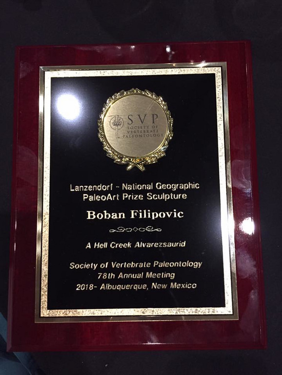 – Награду, коју додељује Друшво за палеонтологију кичмењака, добио сам за тродимензионалну реконструкцију – скулптуру необичног, малог, пернатог диносауруса из фамилије Alvarezsauridae, чији остаци потичу из геолошке формације Hell Creek, која је таложена у Севеној Америци пре 66 милиона година. Ова геолошка формација је позната по томе што из ње потичу Tyrannosaurus rex и Triceratops. Модел је рађен за Музејски центар Дикинсон у Северној Дакоти, у сарадњи са др Денвером Фаулером који ради на опису ове врсте – за „Блиц“ прича Бобан Филиповић.