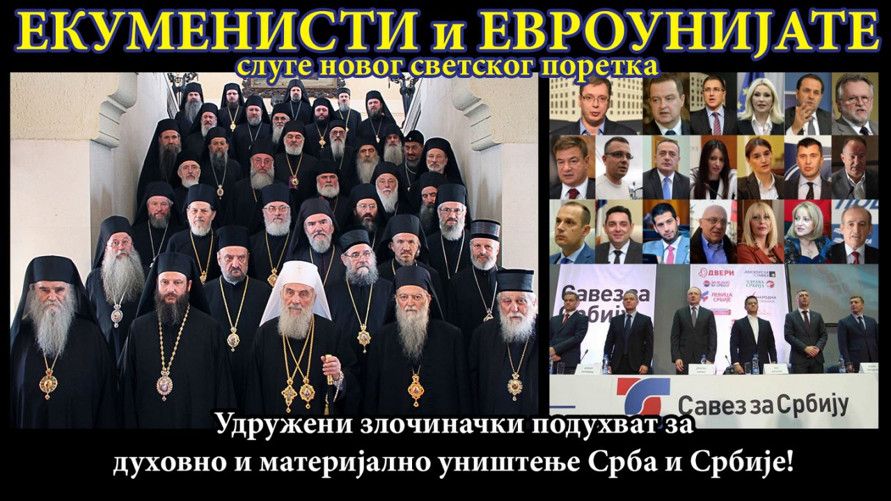 • Колонија Србија је дубоко подељена на народ који покушава да опстане духовно и материјално и да се избори за своје слободе и права, и на издајничку коалицију екумениста у СПЦ и евроунијата на власти или у опозицији, две гране истог зла које теже да униште овај народ и државу, у складу са плановима твораца Новог светског поредка.