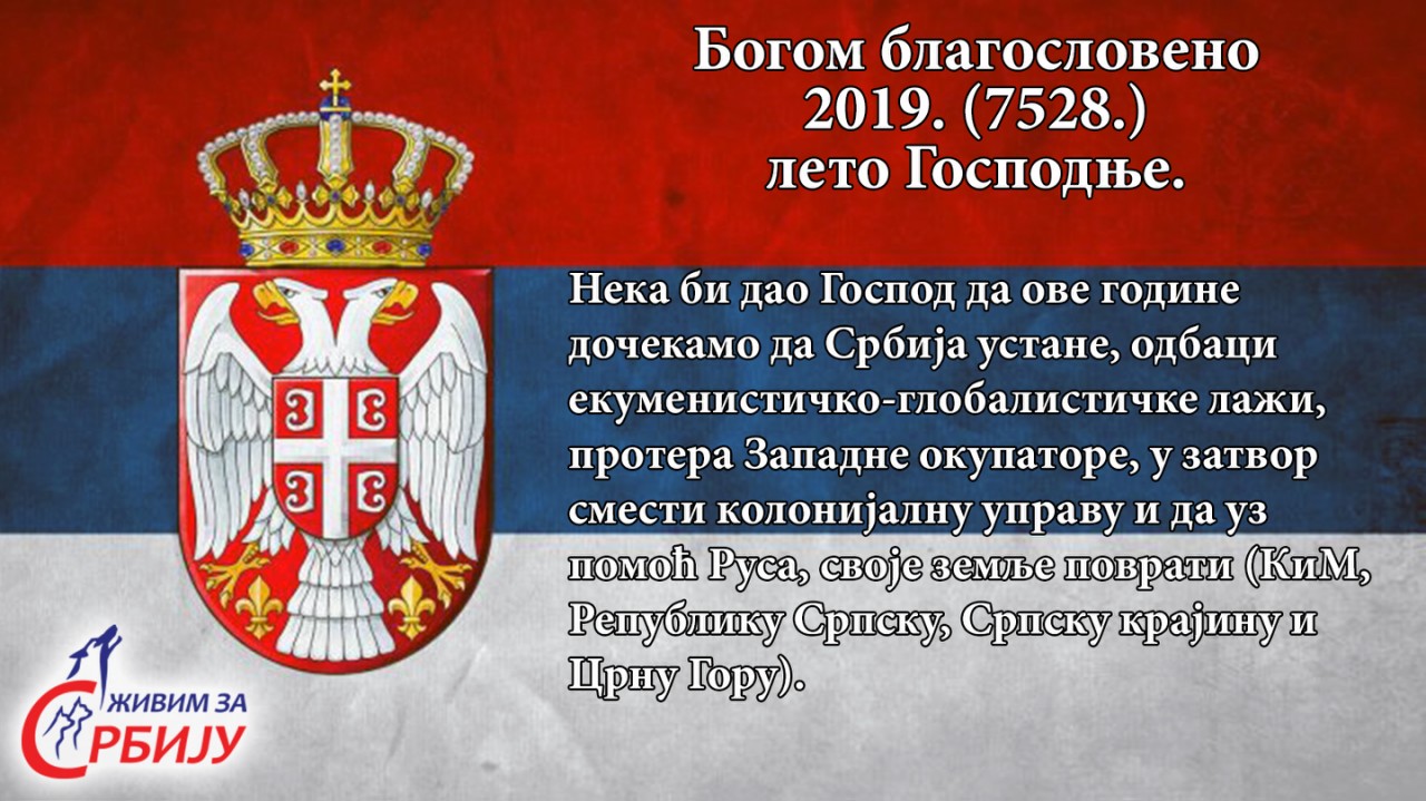 Богом благословено 2019. лете Господње. Нека би дао Господ да ове године дочекамо да Србија устане, одбаци екуменистичко-глобалистичке лажи, протера Западне окупаторе, у затвор смести колонијалну управу и да уз помоћ Русије своје земље поврати (КиМ, Републику Српску, Српску Крајину и Црну Гору).