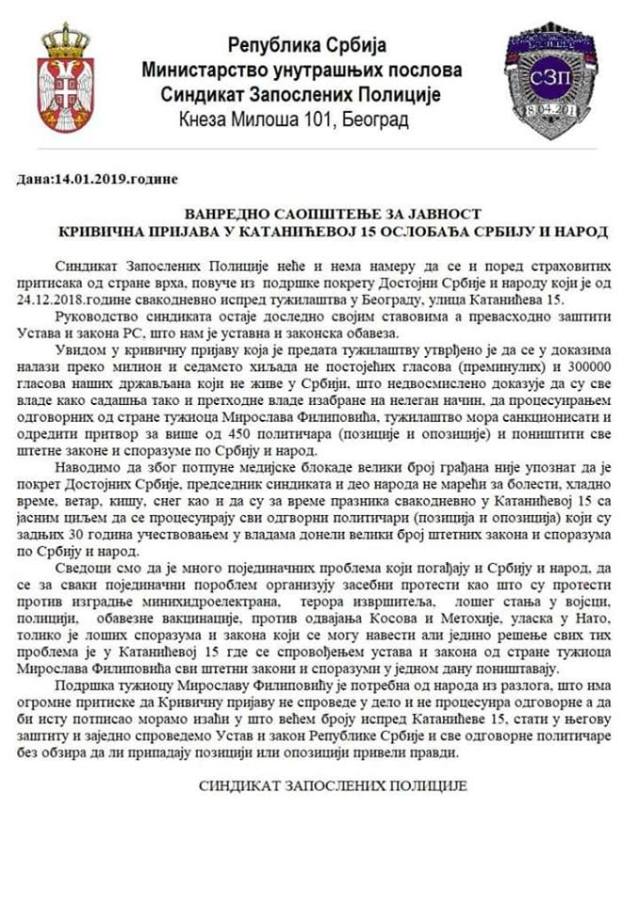 ИЗВОРИ: ФБ страница Достојни Србије, ФБ страница Sindikat Zaposlenih Policije, ФБ страница Мирко Станојевић