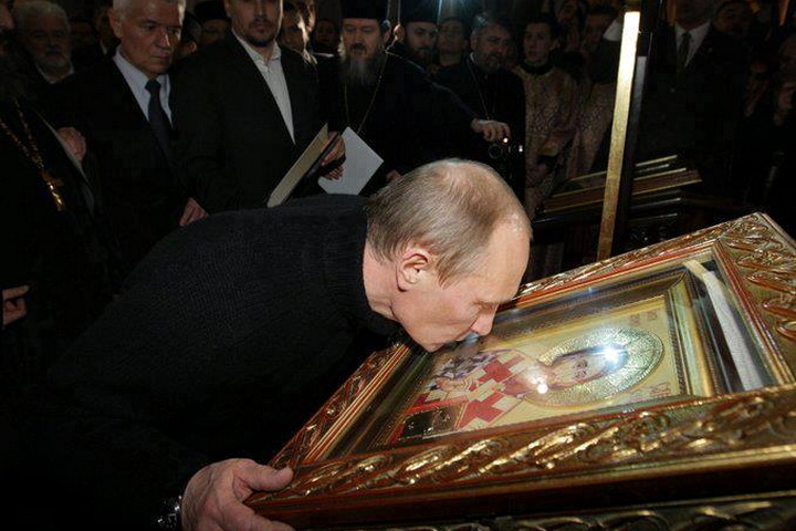 Руски председник Владимир Путин целива икону Светог Саве у храму Светог Саве у Београду, 24. март 2011.