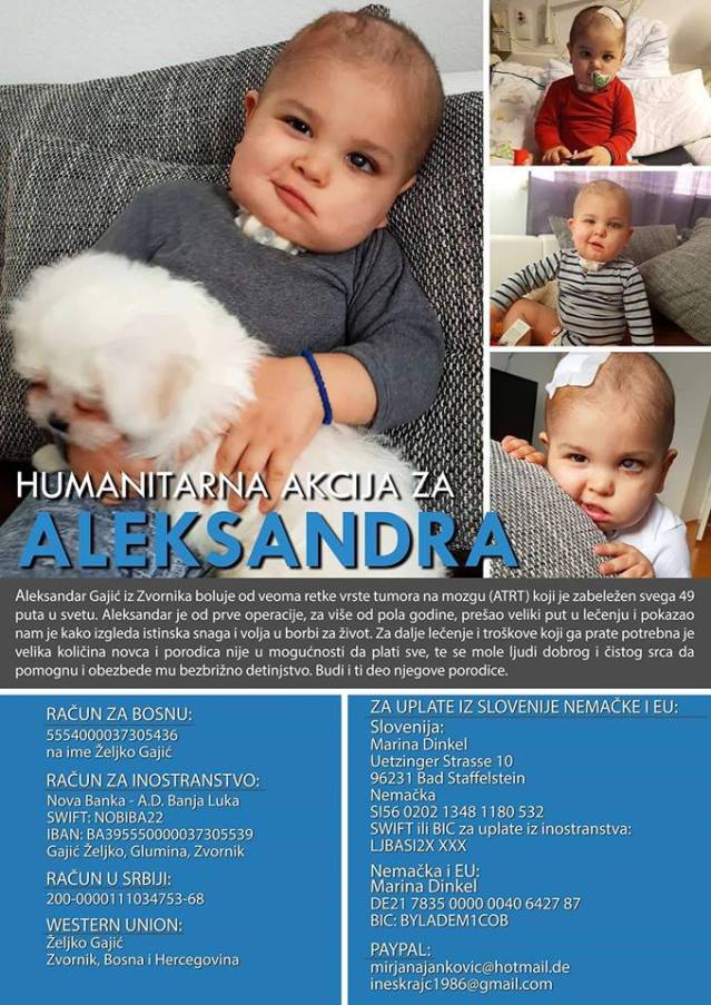 „Молимо све људе добре воље да помогну нашем борцу Александру који има само једну годину и који је оболео од ATRT тумора на мозгу. Од нас, свих добрих људи, све зависи јер ипак 391,000 евра коју болница у Њемачкој тражи није мала сума новца.
