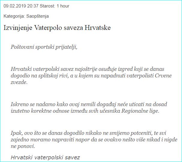“Ispred Hrvatskog vaterpolskog saveza, te u svoje osobno ime, najoštrije osuđujem izgred koji se dogodio na splitskoj rivi, a u kojem su napadnuti vaterpolisti Crvene zvezde. Svaki čin nasilja, ikada, igdje i prema bilo kome je jednostavno neprihvatljiv. U Regionalnoj vaterpolskoj ligi, u 11 sezona koliko se odvija ovo natjecanje nikada nismo imali nikakve izgrede, napade na sportaše ili njihov stožer.