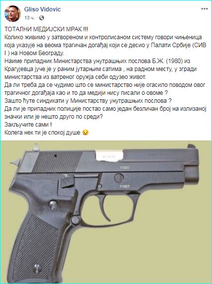 Припадник Министарства унутрашњих послова Б.Ж. (1980) из Крагујевца јуче је у раним јутарњим сатима, на радном месту, у згради министарства из службеног ватреног оружја себи одузео живот.