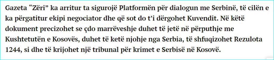 Према писању листа „Зери“, који је имао увид у овој документ, платформа предвиђа и да сваки споразум који се Приштини понуди на потписивање треба да буде у складу са „косовским уставом“.