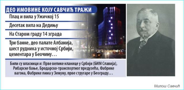 Његова породица потражује и три банке, део Палате „Албанија“, јер су Савчићи били међу већим улагачима у Трговачки фонд, шест рудника у Источној Србији, Беочинску и Раљску цементару…