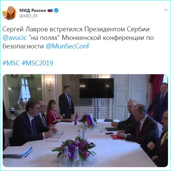 Министар спољних послова Сергеј Лавров одржао је разговоре на маргинама Минхенске безбедносне конференције са председником Србије Александром Вучићем.