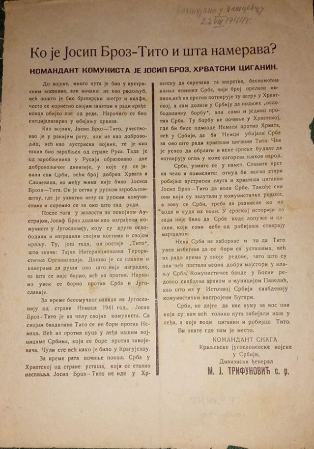 Пре неколико дана на друштвеној мрежи Фејсбук појавио се документ о томе „Ко је Јосип Броз – Тито и шта намерава“ са објашњењем да је „растурано у Пожаревцу“ 22.августа 1944.године, са потписом Команданта снага Краљевске југословенске војске у Србији, дивизијског ђенерала Трифуновића… Преносимо у целости.