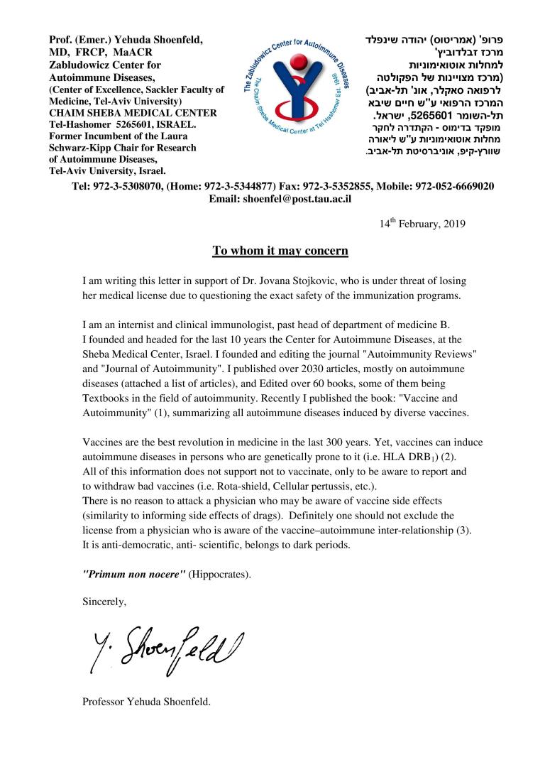 Ја сам интерниста и клинички имунолог, некадашњи шеф Б одељења за медицину. Основао сам и последњих десет година водио Центар за аутоимуне болести у медицинском центру “Шеба” у Израелу. Оснивач сам и уредник часописа “Journal of Autoimmunity”. Објавио сам преко 2030 чланака, углавном о аутоимуним болестима (у прилогу Вам шаљем списак чланака), и уредник сам више од 60 књига, од којих су неке уџбеници из области аутоимунитета.