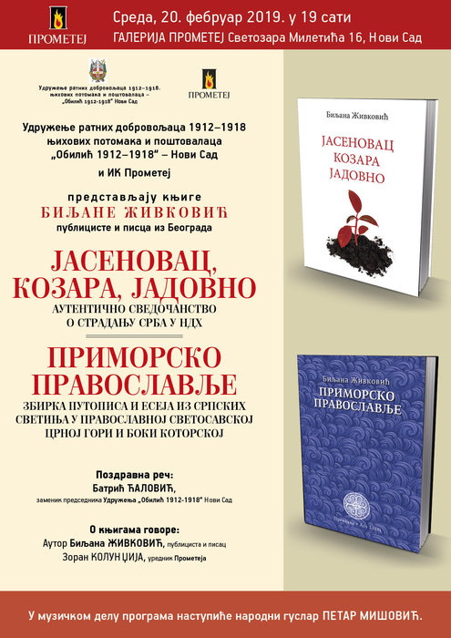 НОВИ САД – У свечаној сали Издавачке куће Прометеј у Новом Саду, у среду, 20. фебруара 2019. године, у 19 часова, биће представљене две књиге Биљане Живковић, публицисте и писца из Београда. Прва књига је аутентично сведочанство о страдању Срба у НДХ – „Јасеновац, Козара, Јадовно“. Друга књига је збирка путописа и есеја „Приморско православље“ из српских светиња у православној светосавској Црној Гори и Боки Которској.