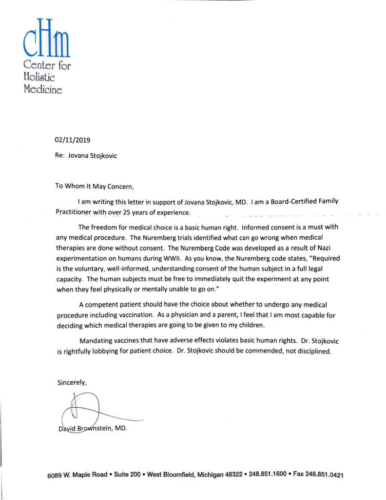 Компетентни пацијент треба да има избор да ли да се подвргне било каквој медицинској процедури, укључујући вакцинацију. Као лекар и родитељ, осећам да сам најспособнији да одлучим које медицинске терапије ће бити дате мојој деци.