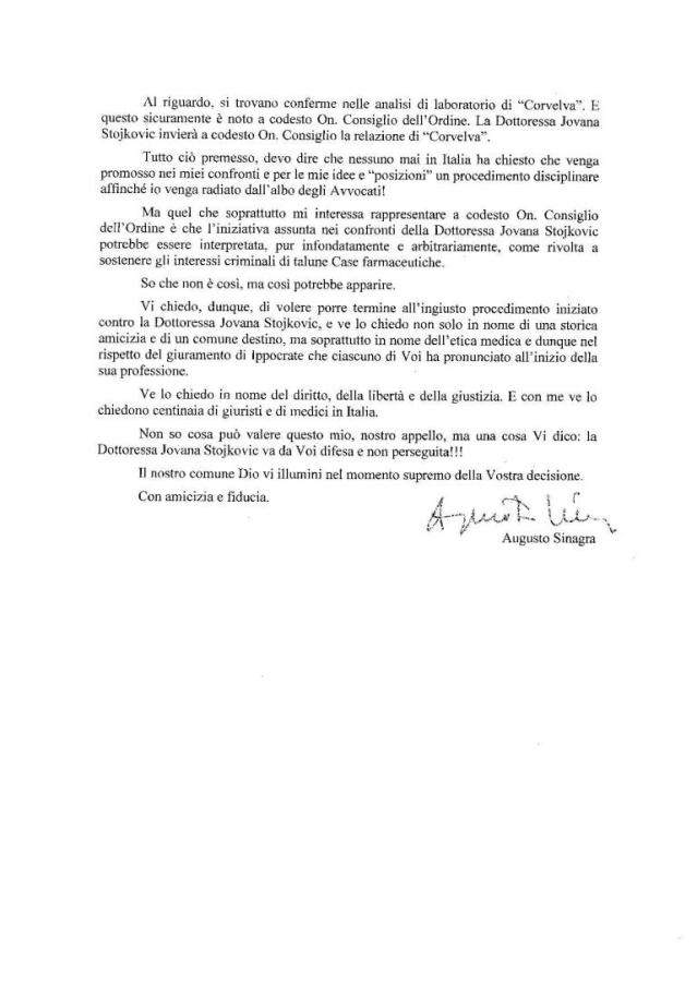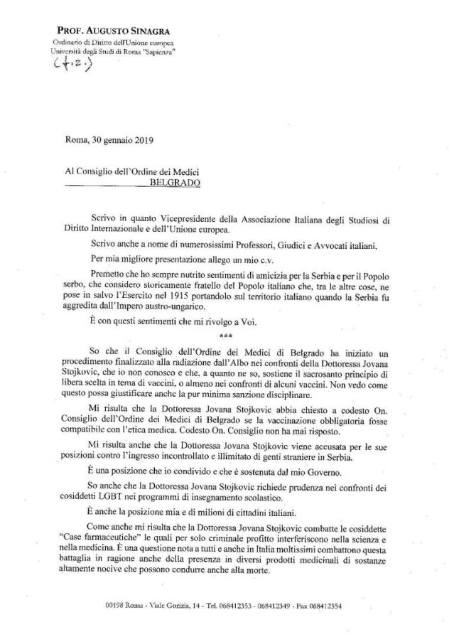 Пишем и у име бројних италијанских професора, судија и правника. Како бих се најбоље представио, приложићу мој C.V. Тврдим да сам одувек осец́ао пријатељство према Србији и српском народу, кога историјски сматрам браћом италијанског народа, који је, између осталог, спасио војску 1915. године и довео је на италијанску територију, када је Србију напало Аустро-Угарско царство. Са тим осећањима се обраћам вама. Знам да је Лекарска комора у Београду покренула процедуру одузимања лиценце др Јовани Стојковић,коју не познајем, и која, колико ја знам, подржава неприкосновени принцип слободног избора приликом вакцинације, или бар против неких вакцина. Не видим како ово може да оправда и најмању дисциплинску санкцију.