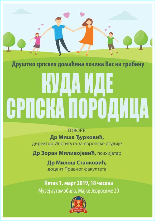 На трибини одржаној 1. марта у музеју аутомобила, у организацији Друштва Српских Домаћина , под називом „Куда иде српска породица“ окупљенима су се обратили др Миша Ђурковић директор института за Европске студије, др Зоран Миливојевић психотерапеут и др Милош Станковић са правог факултета у Београду.