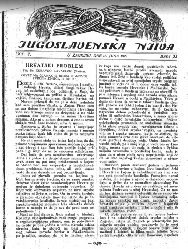 Проучавајући политичке односе у новоствореној југословенској држави после Уједињења 1918, наишао сам давно, пре више од 30 година, на овај чланак једног Хрвата искреног југословенског убеђења. То је чланак др Здравка Ковачевића из Славоније (из градића Слатина – касније Подравска Слатина), 1919. г. члана првог парламента Краљевине СХС („Привремено народно представништво“), писан 30. маја 1921. Чланак ме је запрепастио својом искреношћу и луцидношћу јер до тада нисам схватао да је све битно о односу већине Хрвата према новој држави и према Србима било јасно већ само две године после стварања заједничке државе.