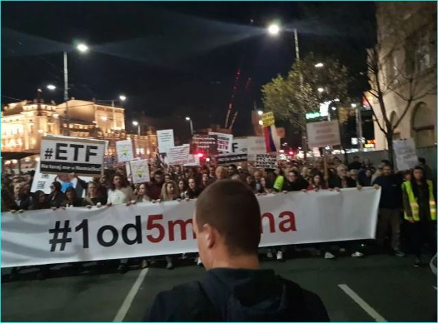 Окупљени којих је између 10 и 20 000 су кренули од Платоа Филозофског факултета ка Теразијама а крајњи циљ је РТС где ће бити главни део протеста и због подсећања да од 9. марта 1991. па до данас ништа се није променило, да над Србијом и даље влада медијски мрак.
