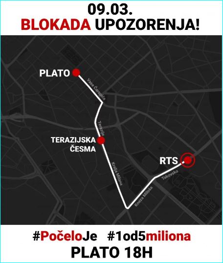 Рута протестне шетње: Плато испред Филозофског факултета – Узун Миркова – Коларчева – Теразије – Краља Милана – Кнеза Милоша – Таковска.