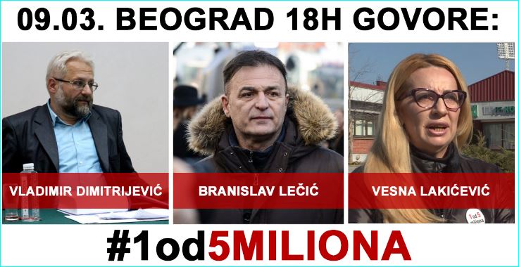 Окупљенима се обратио у име организатора протеста „Један од пет милиона“ др Владимир Димитријевић и подсетио да од 9. марта 1991. године српски народ, нажалост до данашњих дана стално шета и протестује, са жељом да се избори за слободну и правну државу у којој неће да влада диктатура.