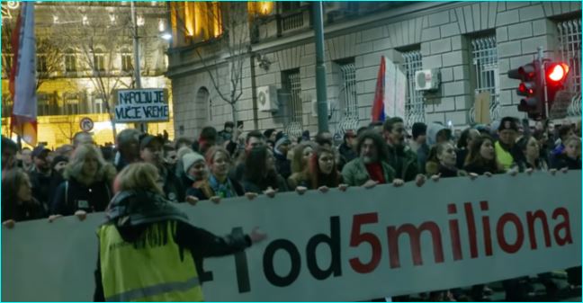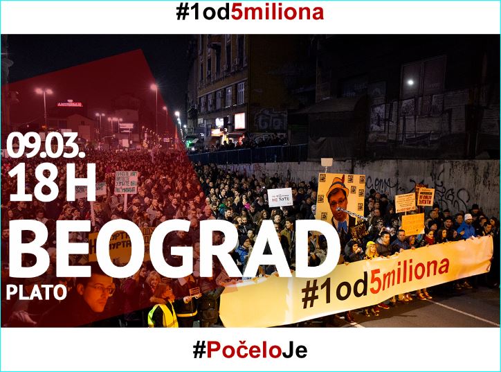 Окупљени којих је између 10 и 20 000 су кренули од Платоа Филозофског факултета ка Теразијама а крајњи циљ је РТС где ће бити главни део протеста и због подсећања да од 9. марта 1991. па до данас ништа се није променило, да над Србијом и даље влада медијски мрак.