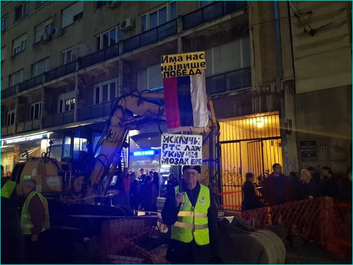 Тренутно је у току са свих страна (од Таковске до Абердареве улице) блокада РТС-а која ће да траје око сат времена. Окупљени демонстранти се налазе на платоу испред РТС-а који је облепљен са налепницама Вучића са натписом „Лажов“.